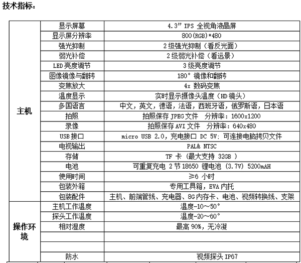 2、6mm雙鏡頭獨(dú)有的環(huán)境溫度檢測(cè)功能,同時(shí)檢測(cè)環(huán)境溫度超過75攝氏度,將自動(dòng)斷開攝像頭電源,有效保護(hù)插入管;