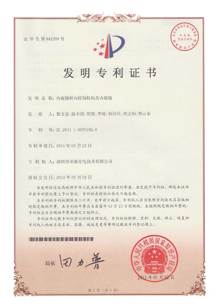 亞泰光電首頁 >> 走進亞泰 >> 亞泰光電資質榮譽 >> 發明專利 >> 內窺鏡轉向控制機構及內窺鏡