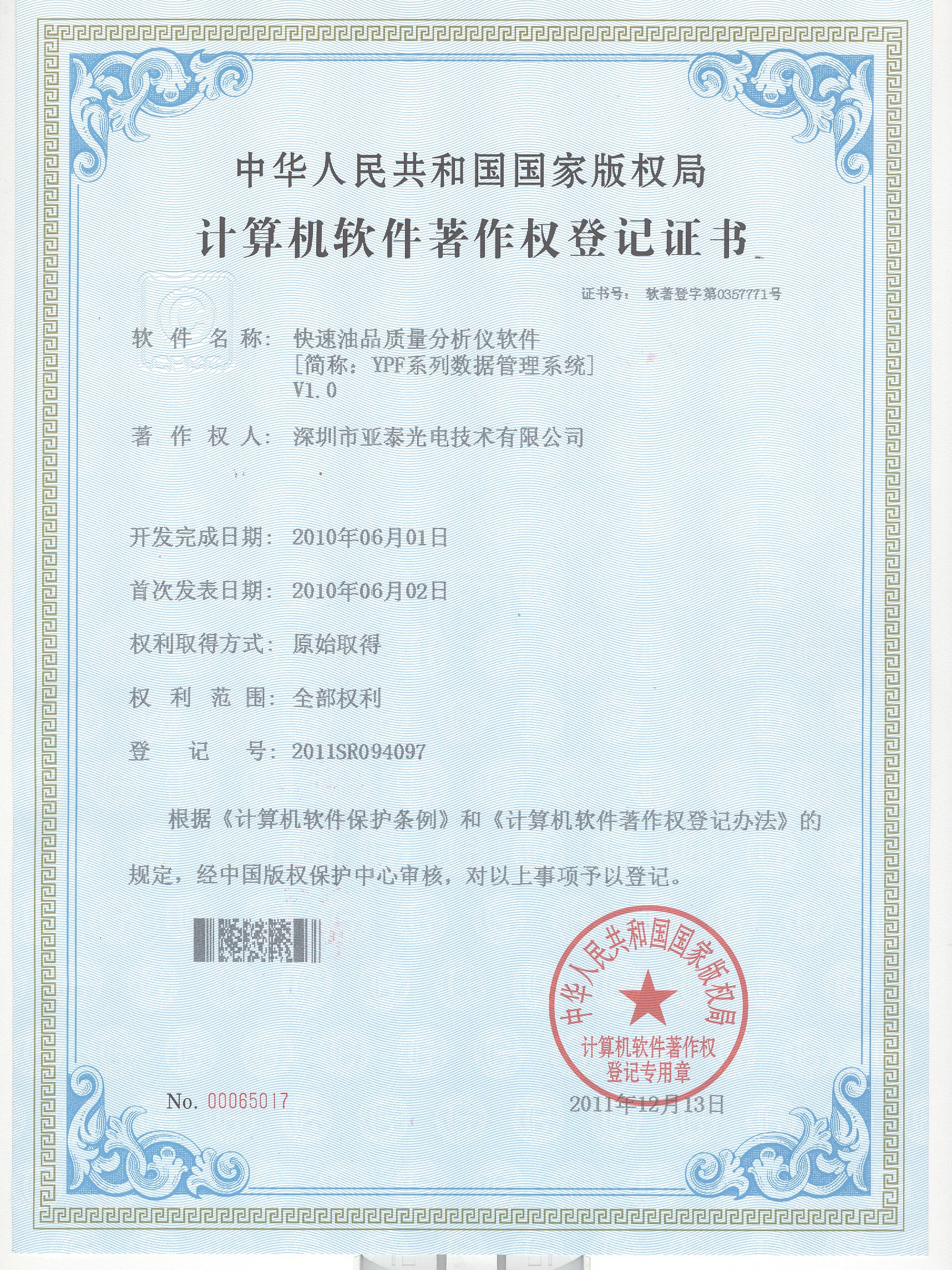 亞泰光電首頁 >> 走進亞泰 >> 亞泰光電資質榮譽 >> 軟件著作權 >> 快速油品質量分析儀軟件