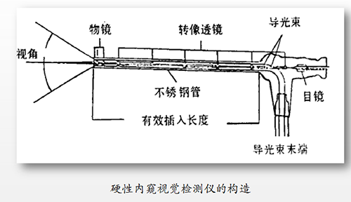 工作原理:利用轉像透鏡光學技術來傳送影像, 并由光導纖維提供傳光照明。為了傳送清晰圖像, 該窺鏡的有效不銹鋼插入部分內設計若干光學元件的轉像透鏡系統。內置光纖把需照相光線從獨立的冷光源直接傳送至工作位置上。