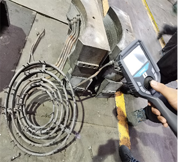客戶現(xiàn)場主要看輪轂磨具內(nèi)部通道的堵塞、脫落、毛刺情況,管通道孔徑13mm, 呈環(huán)狀分布,進口5cm的位置,有雙向的分支通管,亞泰光電MIE高清系列內(nèi)窺鏡的探頭進入導管后,需要分別從兩端進入,本次演示時,沒有2.8mm360°轉向的演示設備,需要手動旋轉管線,預判轉向方位,清晰度方面客戶對MIE內(nèi)窺鏡非常認可。導管內(nèi)部多處焊接的位置,實測時能明顯看見內(nèi)部的焊接堵塞,還有部分脫落,放置貨架的模具,內(nèi)部有大量灰塵、蟲子等多余物。客戶方現(xiàn)場相關負責人表示他們前面找了很久類似的內(nèi)窺鏡產(chǎn)品,對亞泰光電2.2mm內(nèi)窺鏡產(chǎn)品效果很認可,當即表示了進一步合作的意向。
