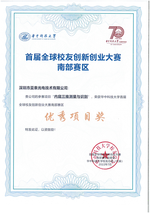 2022年6月26日,華中科技大學(xué)全球校友首屆創(chuàng)新創(chuàng)業(yè)大賽南部賽區(qū)決賽在深圳圓滿收官。深圳市亞泰光電技術(shù)有限公司在此次比賽中,“高靈敏度油液磨粒傳感器設(shè)計(jì)”和“內(nèi)窺三維測量與識別”兩個(gè)項(xiàng)目榮獲“優(yōu)秀項(xiàng)目獎”。