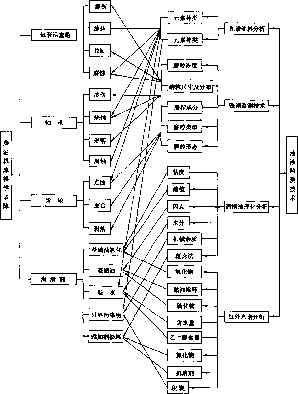 圖2.1柴油機(jī)摩擦學(xué)故障與油液監(jiān)測(cè)方法的相互關(guān)系