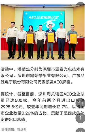 第六屆全球AEO大會將于今年5月在深圳隆重舉行,此次大會受到人民日報的關注,并在“有品質的新聞”進行了專題報道,文中提到:屆時深圳海關領導將向深圳亞泰光電代表頒發AEO牌匾。這一盛會將在全球范圍內進一步推動行業交流與合作,為近千名參會者帶來無與倫比的學習和交流機會。這是該領域最高級別的全球性會議,對于促進貿易強國建設具有重要意義。