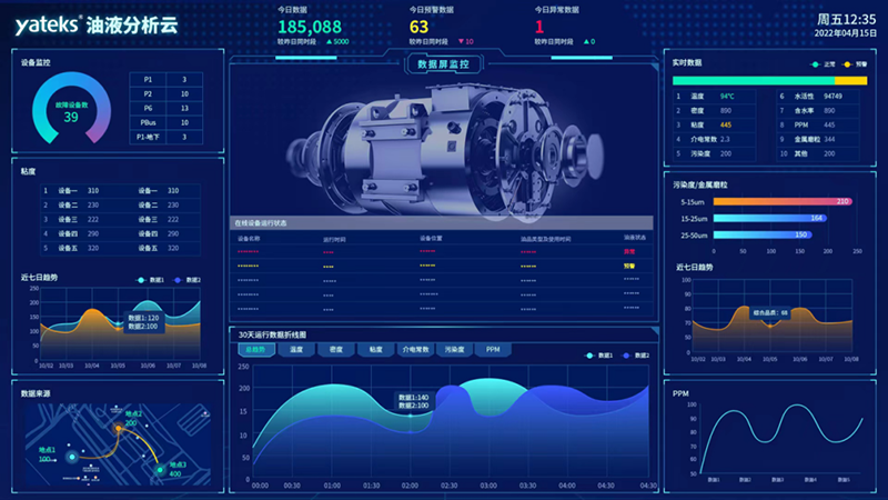亞泰光電的油液在線監測系統集成了多種技術先進的在線油液監測傳感器,實時采集油液的動力粘度、密度、溫度、水分含量、金屬磨粒指標等關鍵參數,并結合AI算法分析數據趨勢,實現從“被動維修”到“主動預防”的跨越。例如:系統可精準監測320號齒輪油的健康狀態,提前預警潤滑系統異常,避免因漸發性故障升級導致的停機損失。