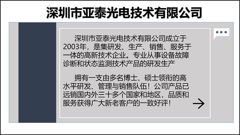 亞泰光電,國家高新技術(shù)企業(yè)和深圳知名品牌,10余年工業(yè)內(nèi)窺鏡和油品分析儀研發(fā)、生產(chǎn)行業(yè)經(jīng)驗,國內(nèi)外知名企業(yè)合作供應(yīng)商,產(chǎn)品優(yōu)惠熱線:13316911816(微信同號) 0755-86656096 0755-86656390 聯(lián)系我們獲取更多優(yōu)惠詳情,期待您的指導(dǎo)與交流!